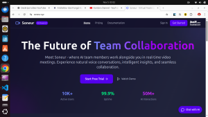 Soneur Meeting Room adalah sebuah implementasi antarmuka berbasis React yang mengintegrasikan berbagai komponen interaktif untuk menunjang kolaborasi daring berbasis kecerdasan buatan. Sistem ini memanfaatkan hooks seperti useState dan useEffect untuk pengelolaan state, serta memanggil layanan eksternal seperti Azure OpenAI, ElevenLabs, dan Tavus untuk fungsi-fungsi analisis, sintesis suara, hingga percakapan video cerdas. Aplikasi ini dirancang dalam konteks pertemuan daring yang kaya fitur, dengan dukungan presentasi, kuis, mindmap, roadmap, dan kartu belajar interaktif.